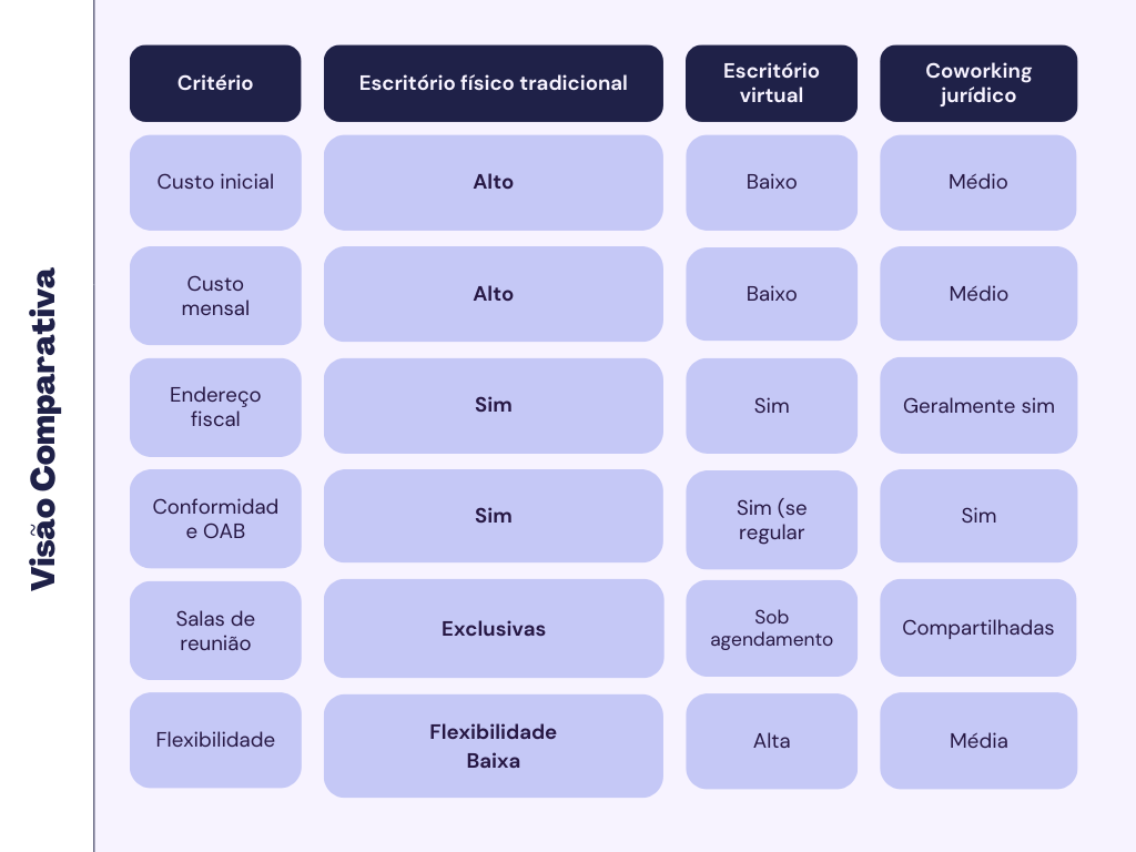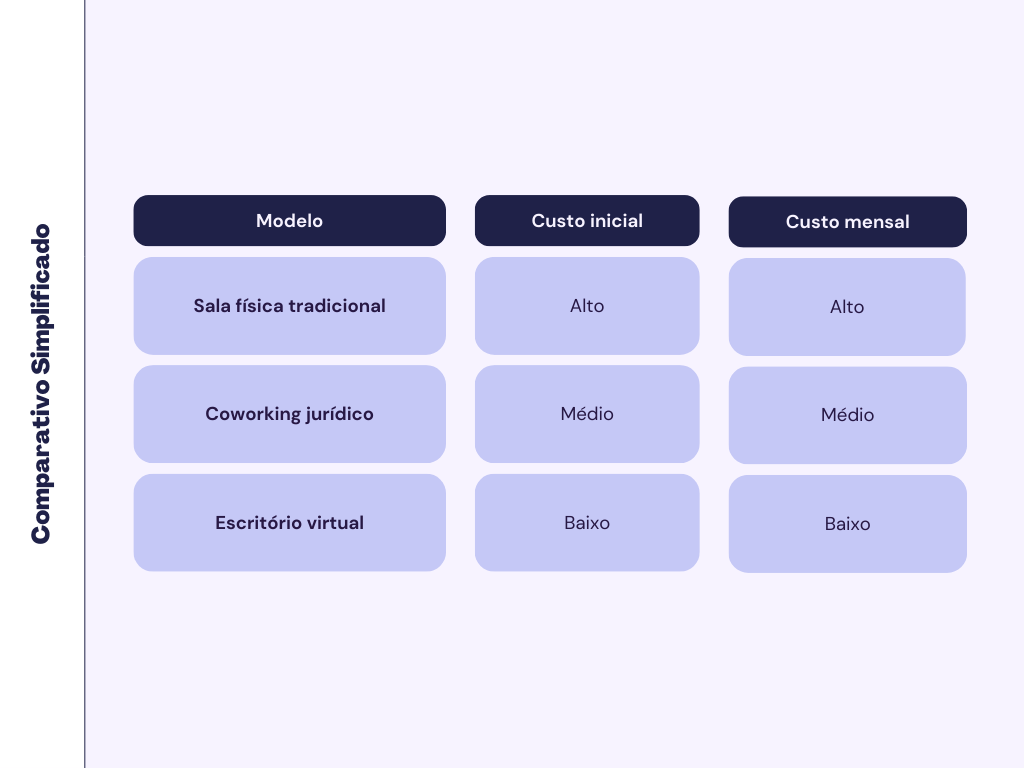 Comparativo: escritório físico × escritório virtual × coworking jurídico